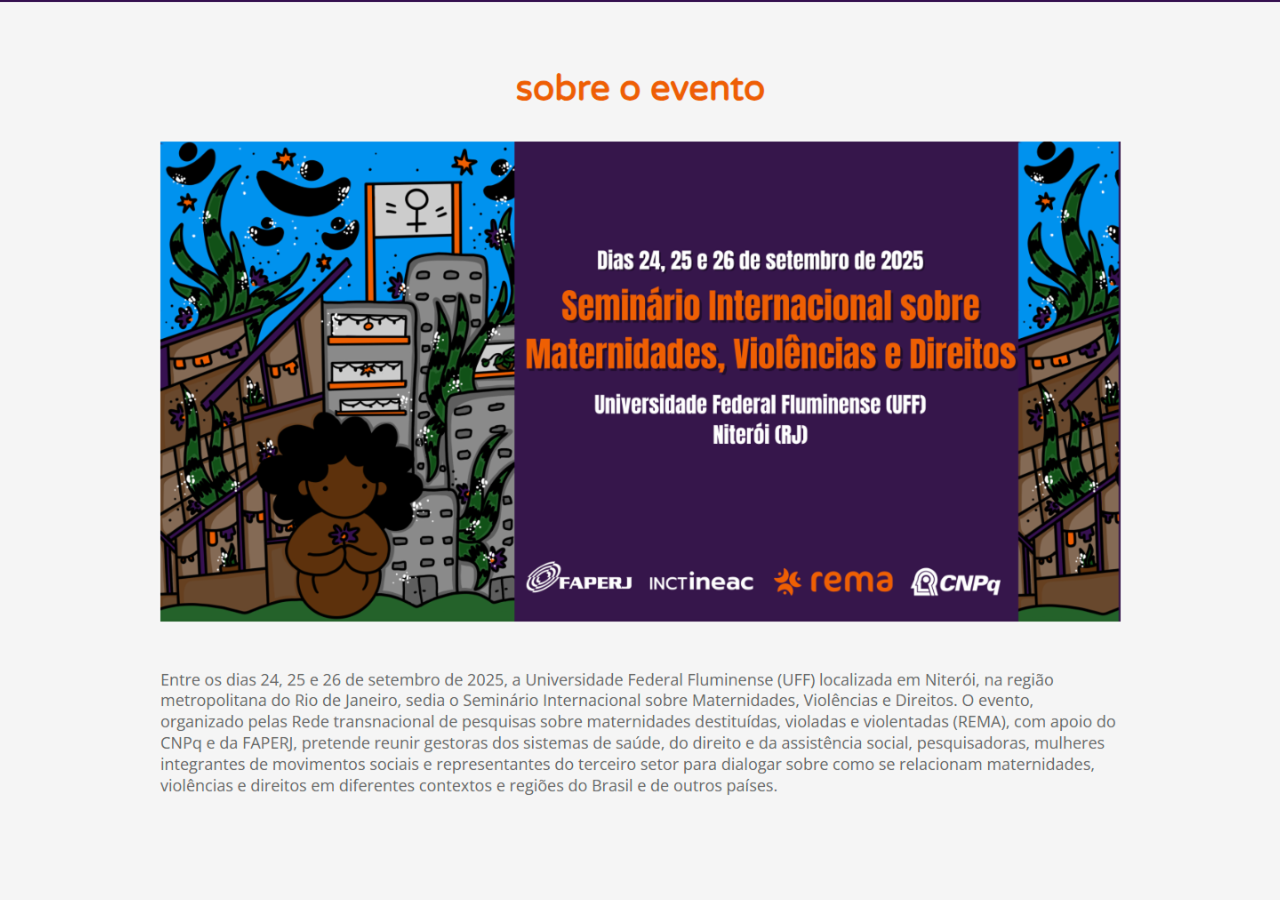 Um evento de três dias organizado pela REMA — Rede Transnacional de Pesquisas sobre Maternidades Destituídas, Violadas e Violentadas, com apoio do CNPq e da FAPERJ. O seminário reúne pesquisadoras, gestoras do sistema de saúde e assistência social, representantes de movimentos sociais e do terceiro setor de diferentes estados e países.