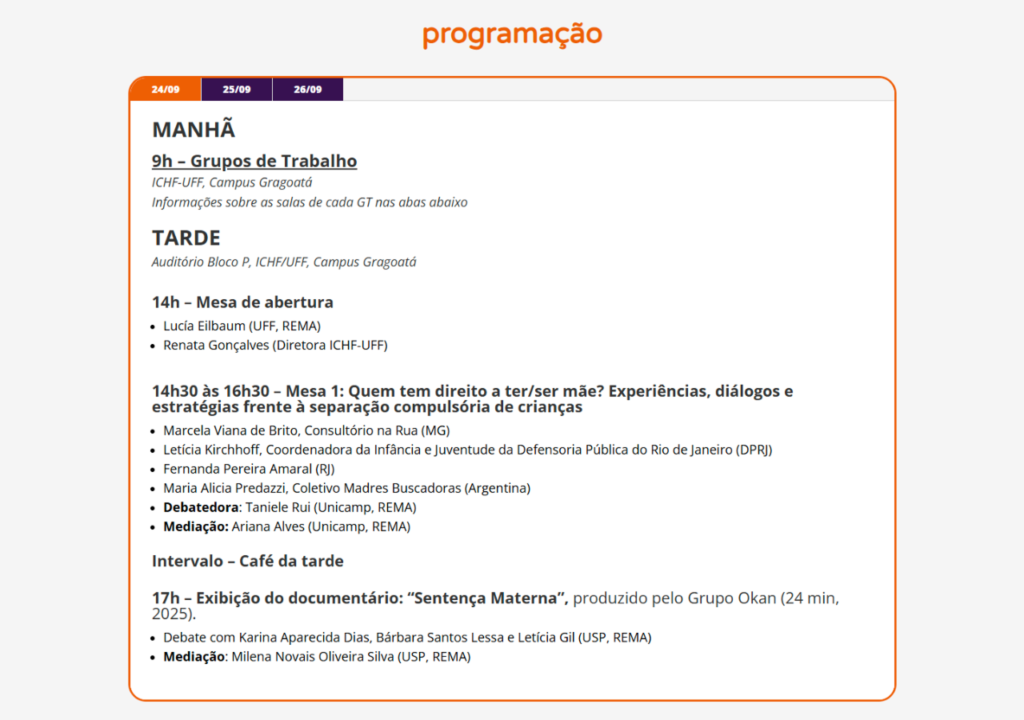 • Programação — os três dias em abas separadas (24, 25 e 26/09), cada uma com manhã e tarde