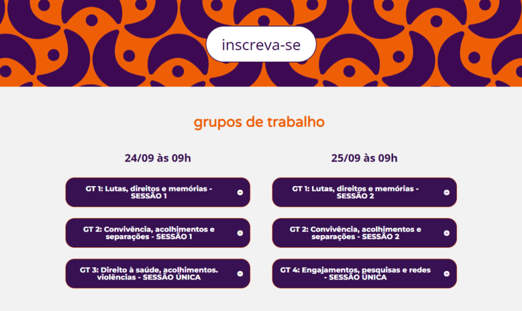 A programação de três dias foi o bloco de conteúdo mais complexo. Cada dia tinha: sessão de GTs pela manhã, mesas temáticas à tarde com múltiplos participantes, debatedoras, mediadoras e atividades específicas — como exibição de documentário, dinâmica de cuidado e roda de conversa.